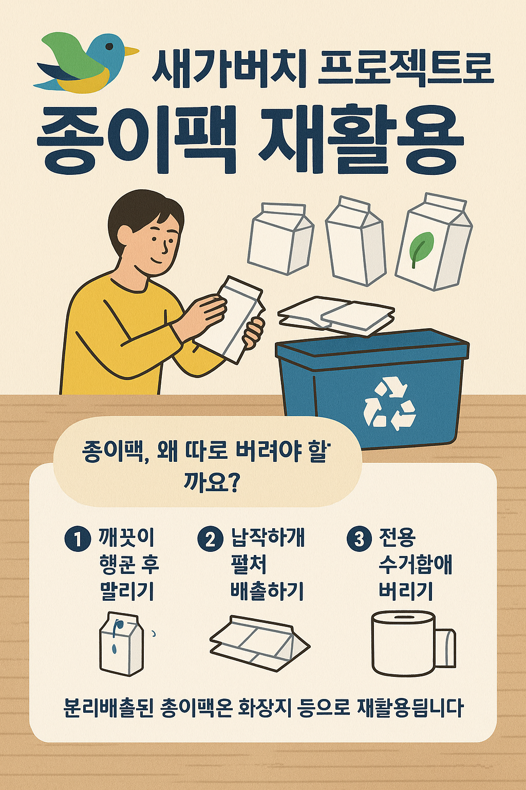 💡 팁: 종이팩은 내용물을 헹구고 펼쳐서 말린 뒤 모아두면 된답니다!